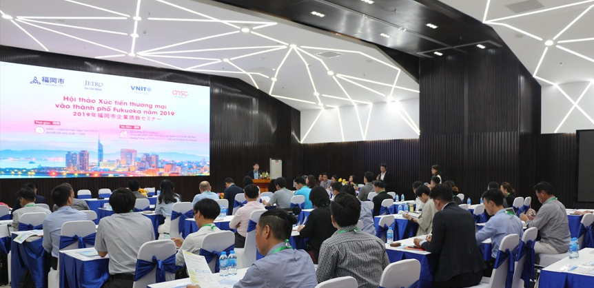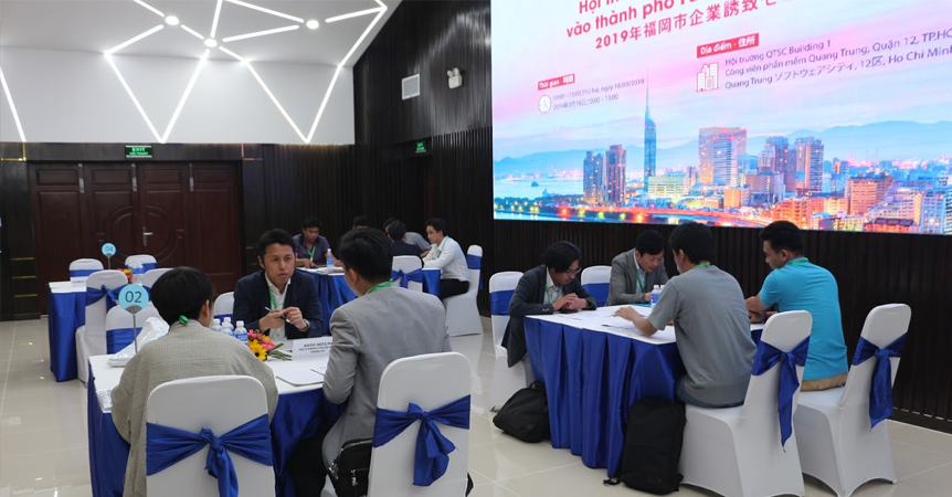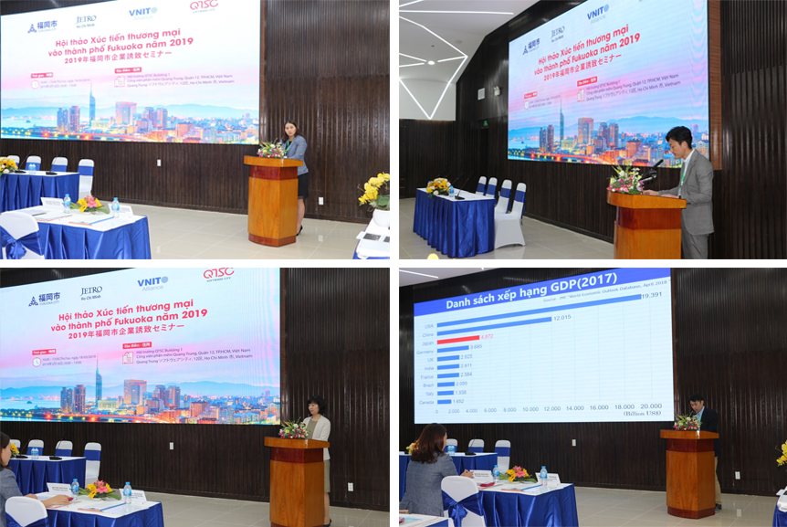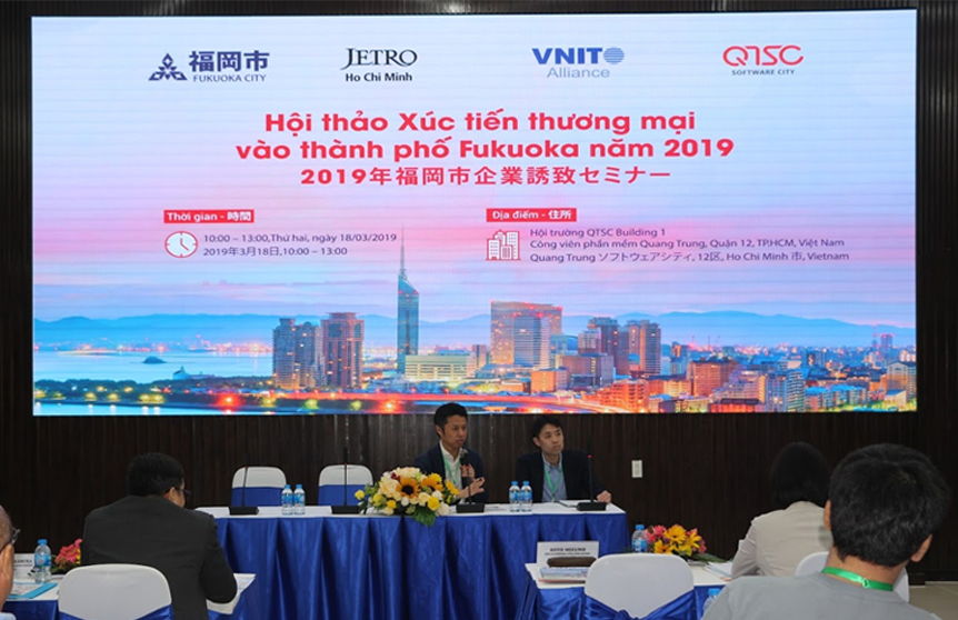 2019年03月18日午前、QTSCビル1会場にてQuang Trungソフトウェアシティ(QTSC)及びVNITOアライアンスは福岡市及びジェトロ・ホーチミン事務所と協業して2019年福岡市企業誘致セミナーを開催しました。